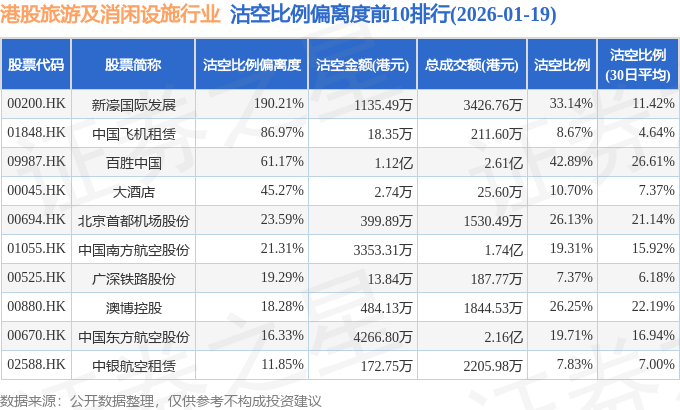 从沽空比例偏离度来看,新濠国际发展、中国飞机租赁、百胜中国沽空比例偏离度位居行业前三,分别为190.21%、86.97%、61.17%。