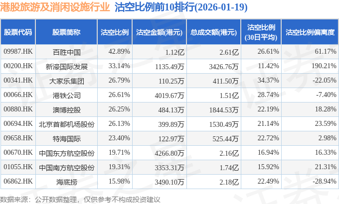 从沽空比例来看,百胜中国、新濠国际发展、大家乐集团沽空比例位居行业前三,分别为42.89%、33.14%、26.79%。