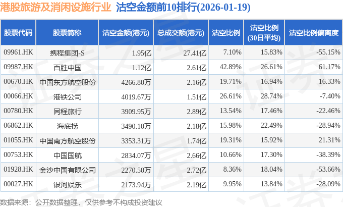 从沽空金额来看,携程集团-S、百胜中国、中国东方航空股份沽空金额位居行业前三,分别为1.95亿港元、1.12亿港元、4266.8万港元。