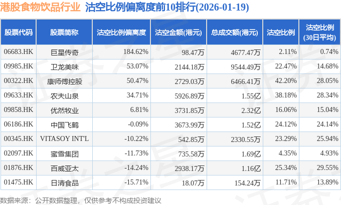 从沽空比例偏离度来看,巨星传奇、卫龙美味、康师傅控股沽空比例偏离度位居行业前三,分别为184.62%、53.07%、50.47%。