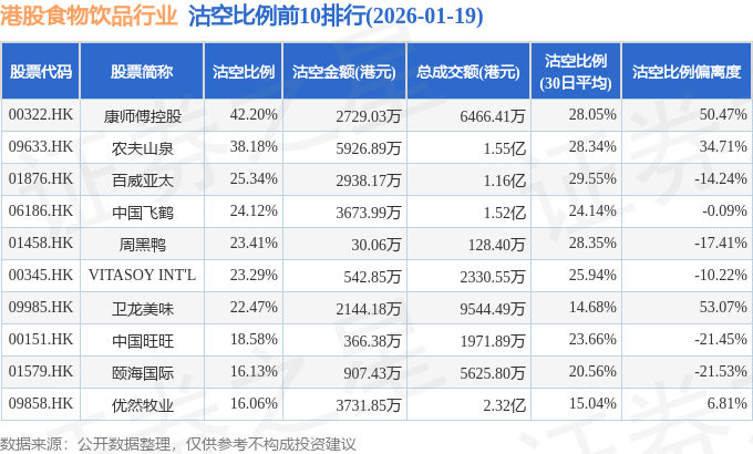 从沽空比例来看,康师傅控股、农夫山泉、百威亚太沽空比例位居行业前三,分别为42.2%、38.18%、25.34%。