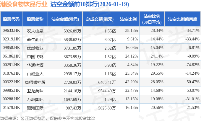 从沽空金额来看,农夫山泉、蒙牛乳业、优然牧业沽空金额位居行业前三,分别为5926.89万港元、5838.62万港元、3731.85万港元。