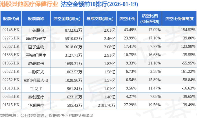 从沽空比例来看,上美股份、华润医疗、H&H国际控股沽空比例位居行业前三,分别为43.49%、27.29%、24.44%。