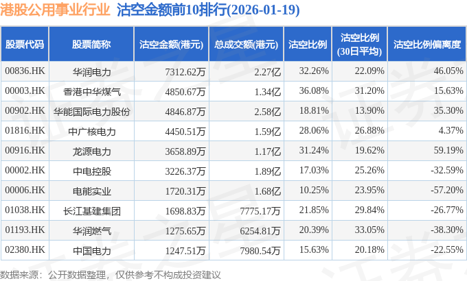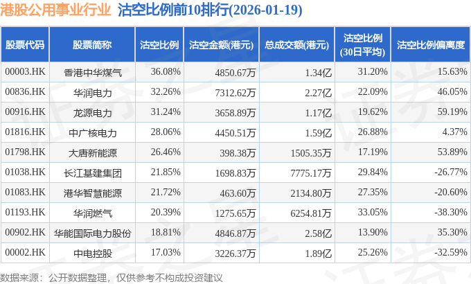 从沽空比例来看,香港中华煤气、华润电力、龙源电力沽空比例位居行业前三,分别为36.08%、32.26%、31.24%。