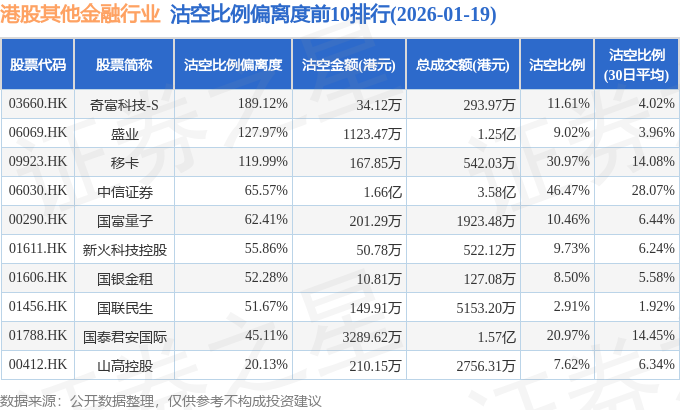由于港股人民币柜台交易股票成交金额较小,沽空比例普遍偏高,为了避免干扰,已将人民币柜台交易股票从排行表格中剔除。
