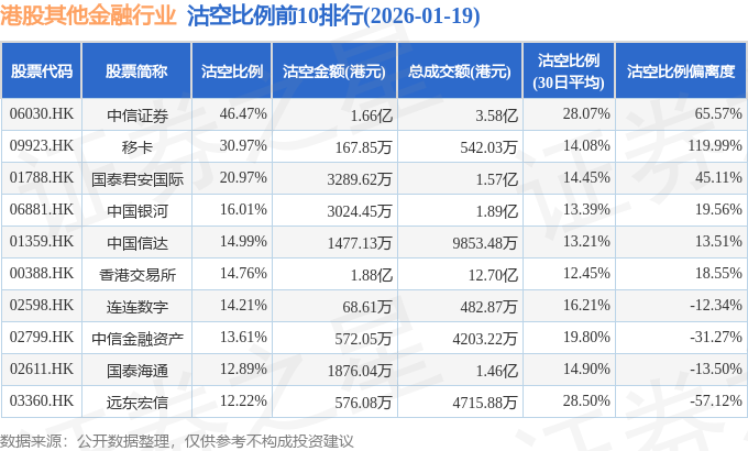 从沽空比例来看,中信证券、移卡、国泰君安国际沽空比例位居行业前三,分别为46.47%、30.97%、20.97%。