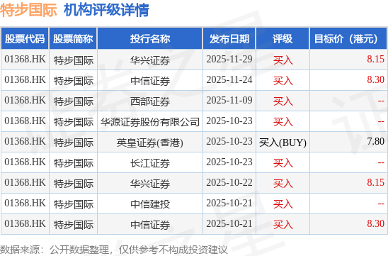 截至2026年1月19日收盘,特步国际(01368.HK)报收于5.21港元,下跌0.95%,成交量642.0万股,成交额3363.91万港元。投行对该股的评级以买入为主,近90天内共有8家投行给出买入评级,近90天的目标均价为8.14港元。华兴证券最新一份研报给予特步国际买入评级,目标价8.15港元。