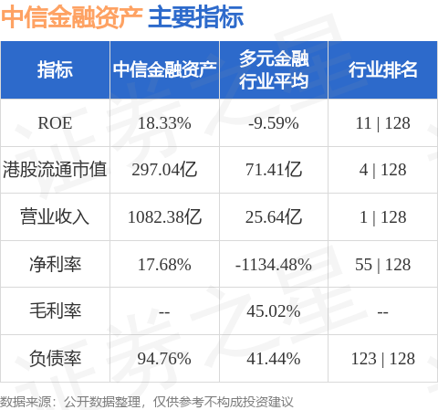中信金融资产港股市值297.04亿港元,在多元金融行业中排名第4。主要指标见下表: