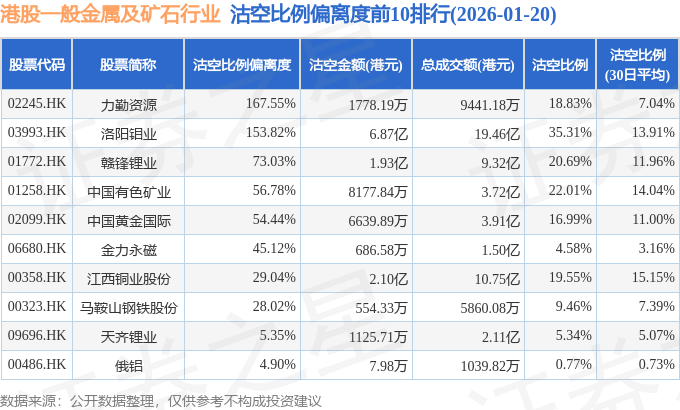 从沽空比例偏离度来看,力勤资源、洛阳钼业、赣锋锂业沽空比例偏离度位居行业前三,分别为167.55%、153.82%、73.03%。