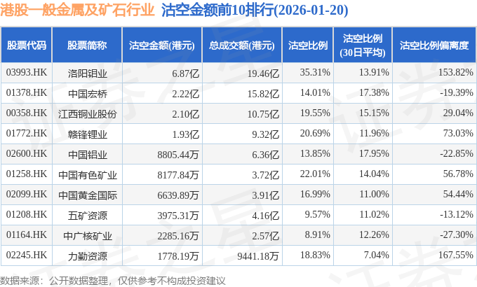 从沽空比例来看,洛阳钼业、中国有色矿业、赣锋锂业沽空比例位居行业前三,分别为35.31%、22.01%、20.69%。