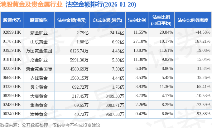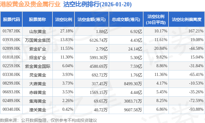 从沽空金额来看,紫金矿业、山东黄金、万国黄金集团沽空金额位居行业前三,分别为2.79亿港元、1.88亿港元、6126.74万港元。