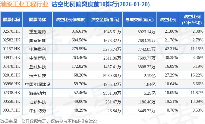 从沽空比例偏离度来看,重塑能源、国富氢能、中联重科沽空比例偏离度位居行业前三,分别为816.61%、684.58%、279.59%。