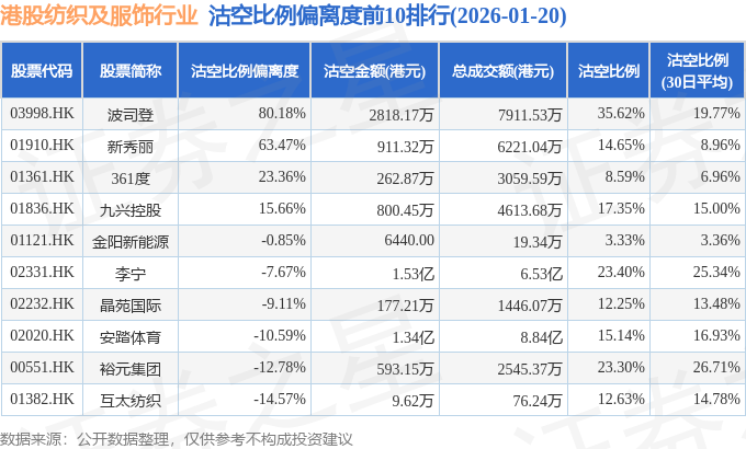 从沽空比例偏离度来看,波司登、新秀丽、361度沽空比例偏离度位居行业前三,分别为80.18%、63.47%、23.36%。