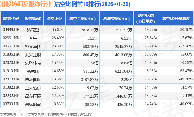 从沽空比例来看,波司登、李宁、裕元集团沽空比例位居行业前三,分别为35.62%、23.4%、23.3%。