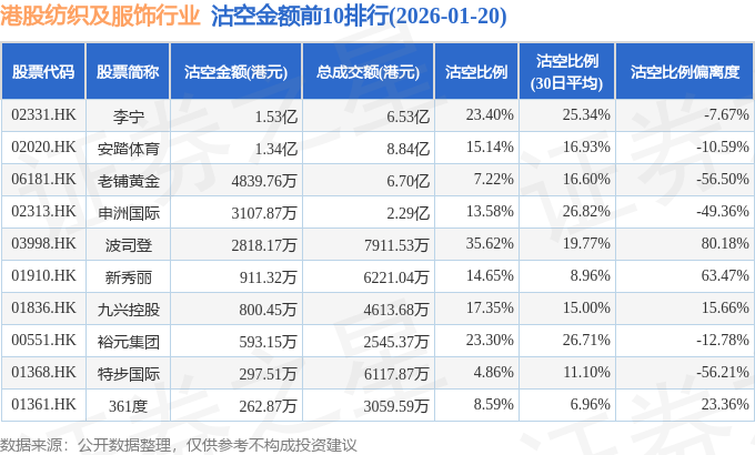 从沽空金额来看,李宁、安踏体育、老铺黄金沽空金额位居行业前三,分别为1.53亿港元、1.34亿港元、4839.76万港元。
