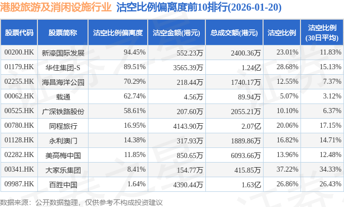 从沽空比例偏离度来看,新濠国际发展、华住集团-S、海昌海洋公园沽空比例偏离度位居行业前三,分别为94.45%、89.51%、70.29%。