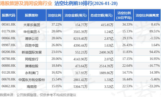 从沽空比例来看,大家乐集团、华住集团-S、港铁公司沽空比例位居行业前三,分别为37.22%、28.68%、28.66%。
