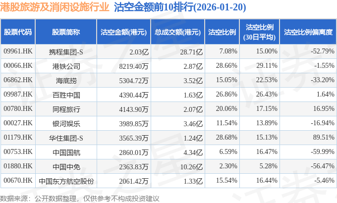 从沽空金额来看,携程集团-S、港铁公司、海底捞沽空金额位居行业前三,分别为2.03亿港元、8219.4万港元、5304.72万港元。