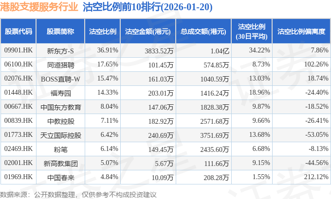 从沽空比例来看,新东方-S、同道猎聘、BOSS直聘-W沽空比例位居行业前三,分别为36.91%、17.65%、15.47%。