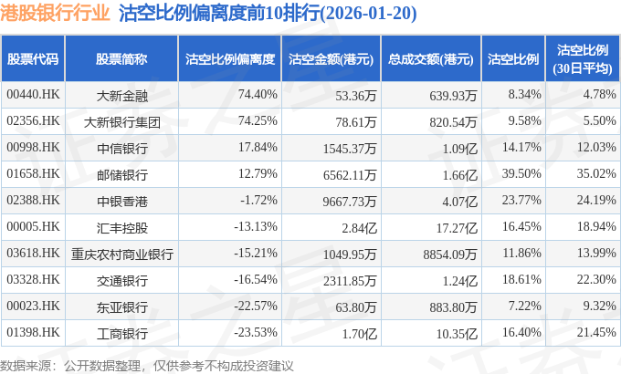 从沽空比例偏离度来看,大新金融、大新银行集团、中信银行沽空比例偏离度位居行业前三,分别为74.4%、74.25%、17.84%。