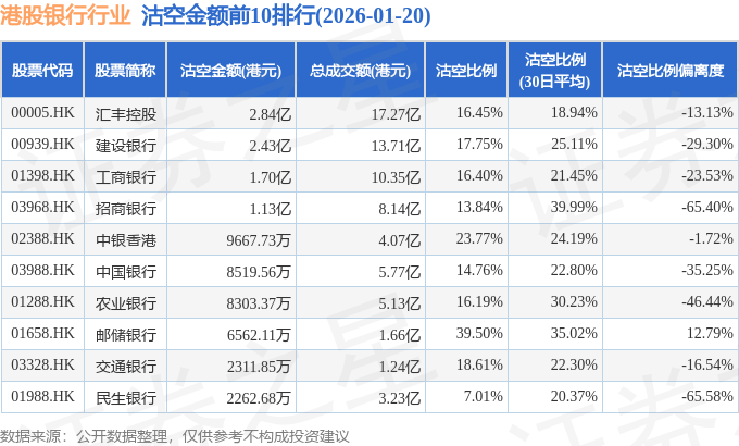 从沽空金额来看,汇丰控股、建设银行、工商银行沽空金额位居行业前三,分别为2.84亿港元、2.43亿港元、1.7亿港元。