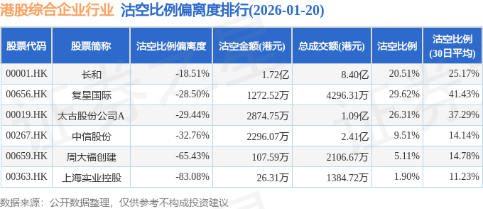 从沽空比例偏离度来看,长和、复星国际、太古股份公司A沽空比例偏离度位居行业前三,分别为-18.51%、-28.5%、-29.44%。