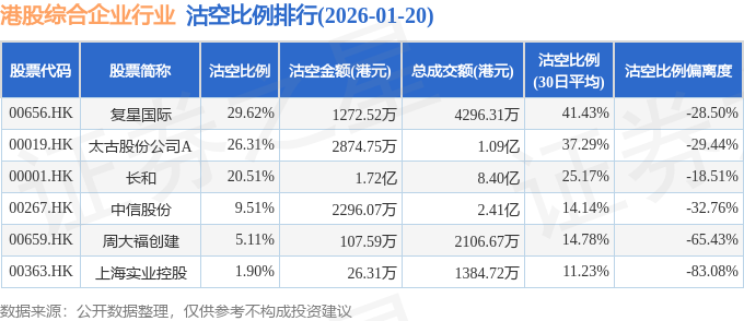 从沽空比例来看,复星国际、太古股份公司A、长和沽空比例位居行业前三,分别为29.62%、26.31%、20.51%。