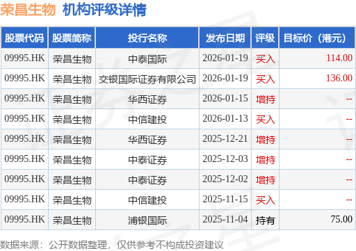 投行对该股的评级以增持为主,近90天内共有4家投行给出增持评级,近90天的目标均价为108.33港元。中泰国际最新一份研报给予荣昌生物买入评级,目标价114港元。