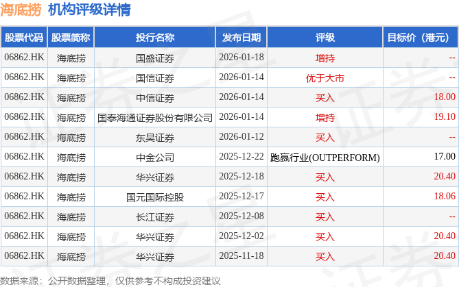 投行对该股的评级以买入为主,近90天内共有7家投行给出买入评级,近90天的目标均价为19.05港元。国盛证券最新一份研报给予海底捞增持评级。