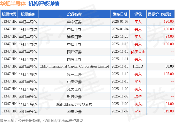 投行对该股的评级以买入为主,近90天内共有10家投行给出买入评级,近90天的目标均价为99.62港元。华泰证券最新一份研报给予华虹半导体买入评级,目标价120港元。