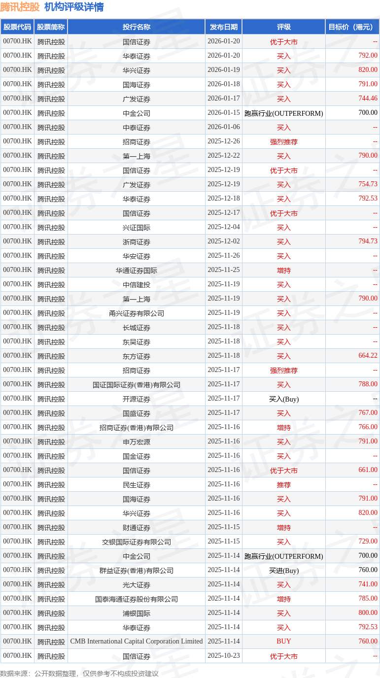 投行对该股的评级以买入为主,近90天内共有27家投行给出买入评级,近90天的目标均价为764.82港元。国信证券最新一份研报给予腾讯控股优于大市评级。