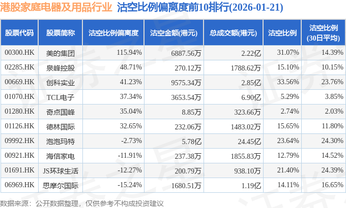 从沽空比例偏离度来看,美的集团、泉峰控股、创科实业沽空比例偏离度位居行业前三,分别为115.94%、48.71%、41.23%。