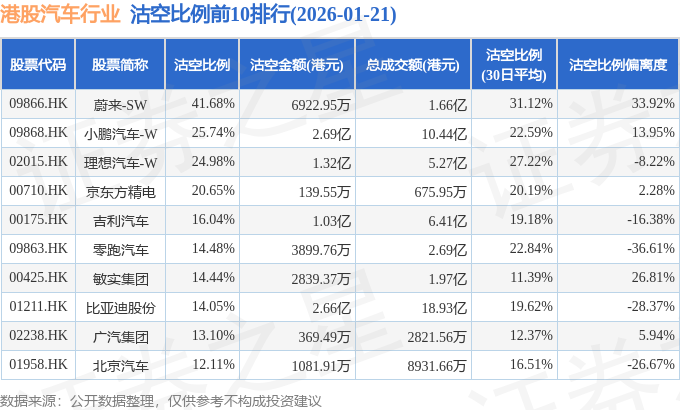 从沽空比例来看,蔚来-SW、小鹏汽车-W、理想汽车-W沽空比例位居行业前三,分别为41.68%、25.74%、24.98%。