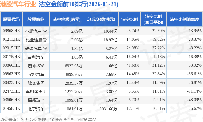 从沽空金额来看,小鹏汽车-W、比亚迪股份、理想汽车-W沽空金额位居行业前三,分别为2.69亿港元、2.66亿港元、1.32亿港元。
