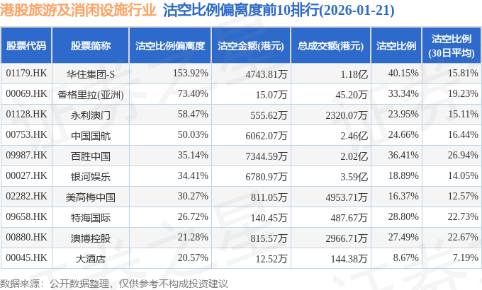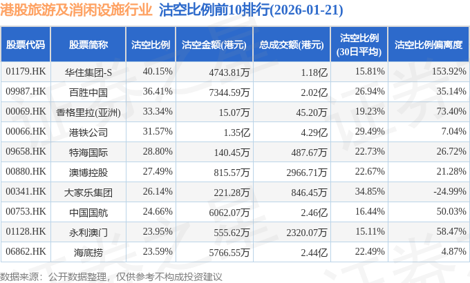 从沽空比例偏离度来看,华住集团-S、香格里拉(亚洲)、永利澳门沽空比例偏离度位居行业前三,分别为153.92%、73.4%、58.47%。