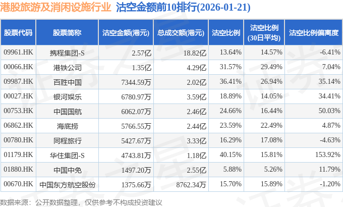 证券之星消息,1月21日港交所披露数据显示,当日港股旅游及消闲设施行业的137只个股中有32只被沽空,总沽空股数为3945.8万股,总沽空金额为8.47亿元(港元),而当日旅游及消闲设施行业的总成交金额为51.25亿元(港元),沽空比例为16.52%。当日旅游及消闲设施行业总体涨0.49%。