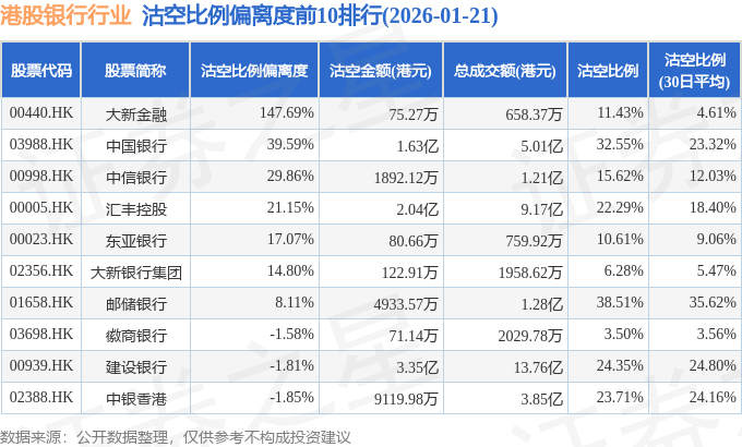 从沽空比例偏离度来看,大新金融、中国银行、中信银行沽空比例偏离度位居行业前三,分别为147.69%、39.59%、29.86%。