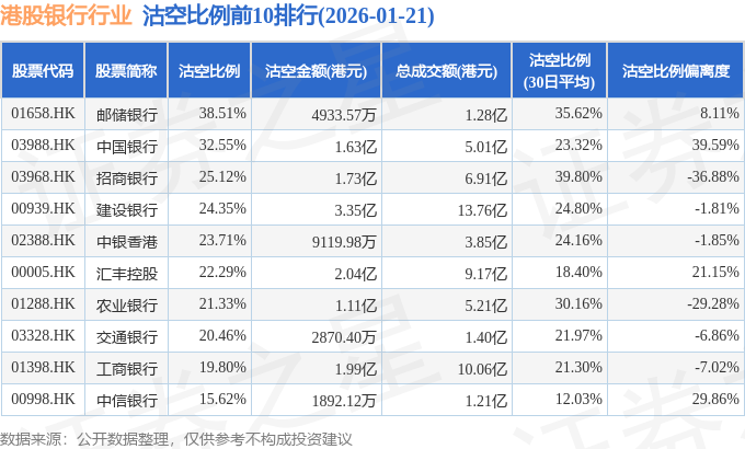 从沽空比例来看,邮储银行、中国银行、招商银行沽空比例位居行业前三,分别为38.51%、32.55%、25.12%。
