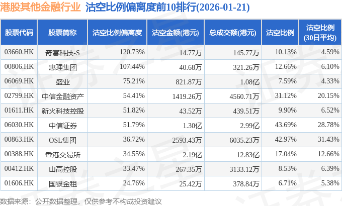 从沽空比例偏离度来看,奇富科技-S、惠理集团、盛业沽空比例偏离度位居行业前三,分别为120.73%、107.44%、75.21%。