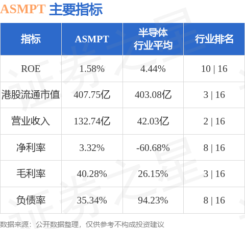 ASMPT港股市值407.75亿港元,在半导体行业中排名第3。主要指标见下表: