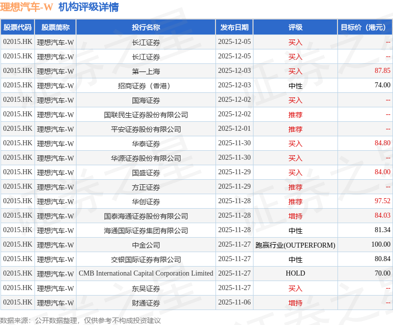 投行对该股的评级以买入为主,近90天内共有8家投行给出买入评级,近90天的目标均价为84.44港元。长江证券最新一份研报给予理想汽车-W买入评级。