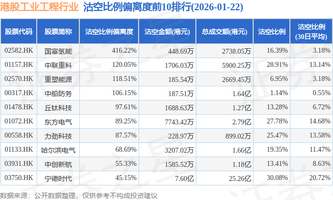 从沽空比例偏离度来看,国富氢能、中联重科、重塑能源沽空比例偏离度位居行业前三,分别为416.22%、120.05%、118.51%。