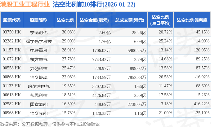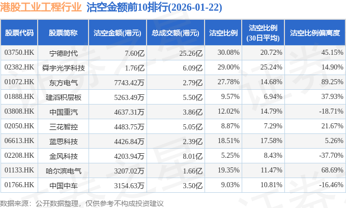 从沽空金额来看,宁德时代、舜宇光学科技、东方电气沽空金额位居行业前三,分别为7.6亿港元、1.76亿港元、7743.42万港元。