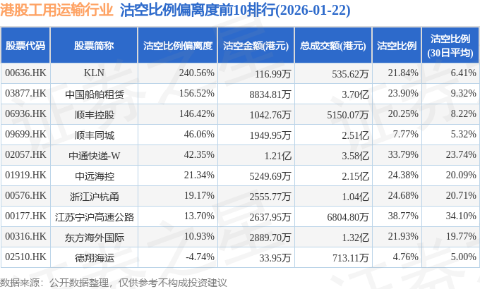 从沽空金额来看,中通快递-W、中国船舶租赁、中远海控沽空金额位居行业前三,分别为1.21亿港元、8834.81万港元、5249.69万港元。