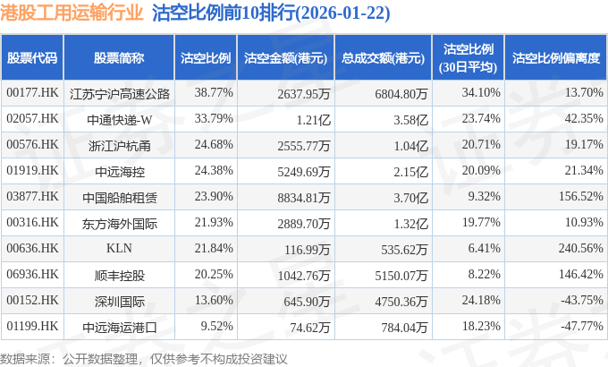 从沽空比例来看,江苏宁沪高速公路、中通快递-W、浙江沪杭甬沽空比例位居行业前三,分别为38.77%、33.79%、24.68%。