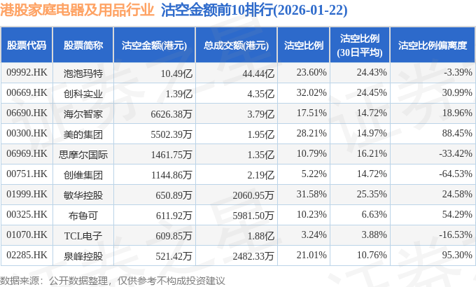 从沽空金额来看,泡泡玛特、创科实业、海尔智家沽空金额位居行业前三,分别为10.49亿港元、1.39亿港元、6626.38万港元。