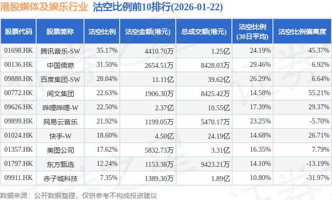 从沽空比例来看,腾讯音乐-SW、中国儒意、百度集团-SW沽空比例位居行业前三,分别为35.17%、31.5%、28.04%。