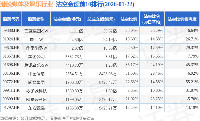 从沽空金额来看,百度集团-SW、快手-W、哔哩哔哩-W沽空金额位居行业前三,分别为11.11亿港元、4.5亿港元、2.37亿港元。