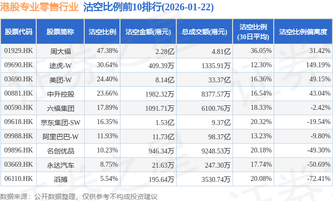 由于港股人民币柜台交易股票成交金额较小,沽空比例普遍偏高,为了避免干扰,已将人民币柜台交易股票从排行表格中剔除。