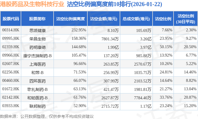 从沽空比例偏离度来看,思派健康、荣昌生物、药明康德沽空比例偏离度位居行业前三,分别为232.95%、158.36%、144.68%。
